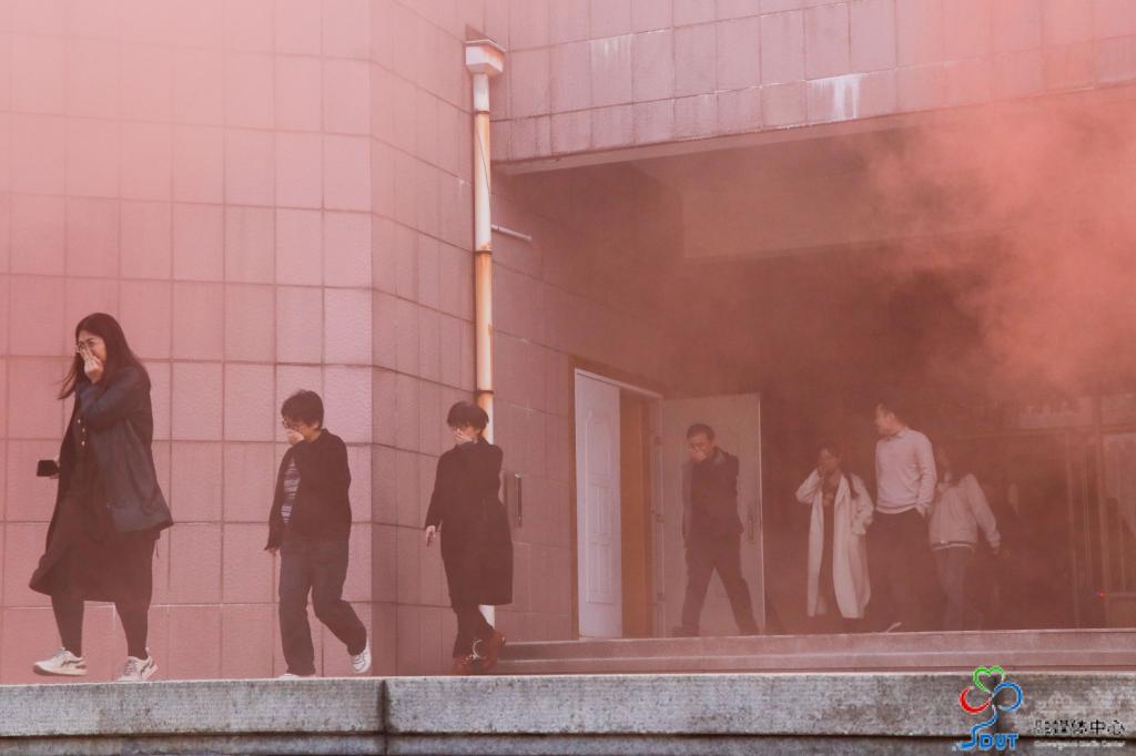 演练模拟情景设定为鸿远楼202室因电器短路发生火情导致楼内浓烟弥漫,发现火情后立即启动消防应急疏散预案。16时00分,安全保卫处负责人发出演练信号,指挥组点燃模拟烟雾、发出火灾警报,各楼层安全员按照疏散路线指挥引导,参训人员用湿毛巾捂住口鼻、弯腰低姿沿安全通道紧张有序地向指定安全区域撤离。整个疏散过程组织严密、分工明确,仅用时3分钟,参训人员便安全疏散至集结地,达到预期效果。